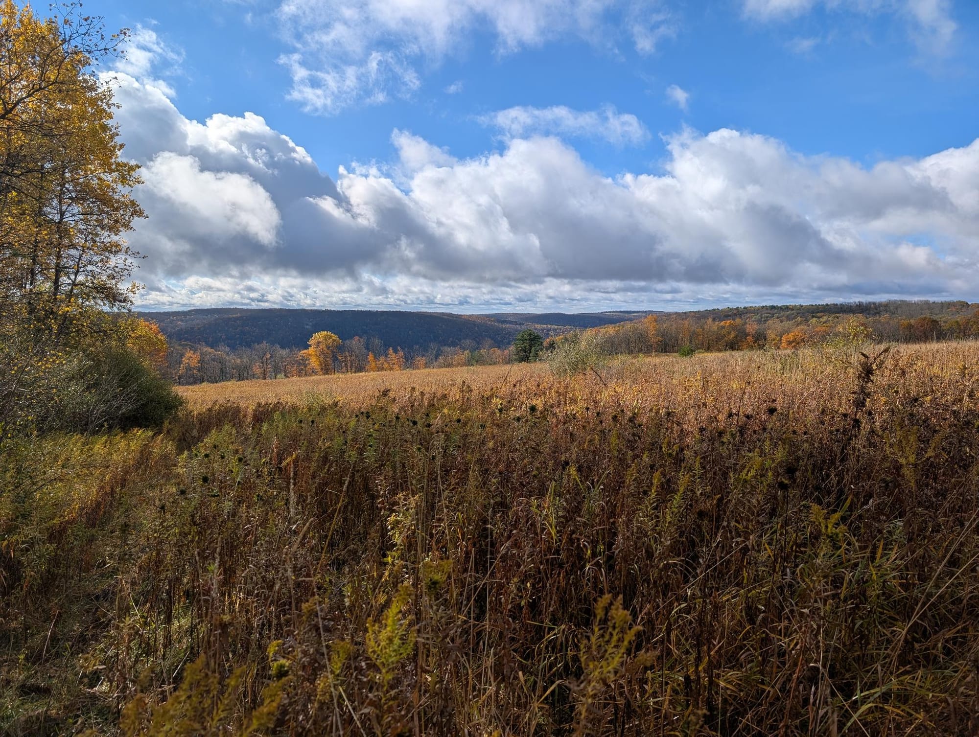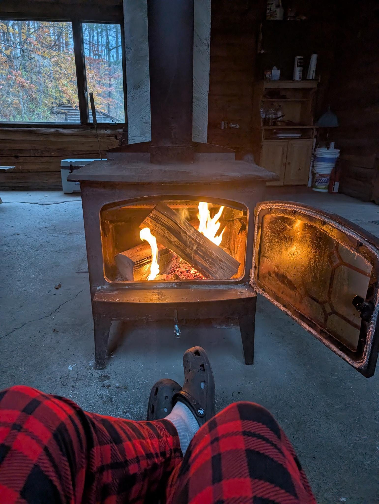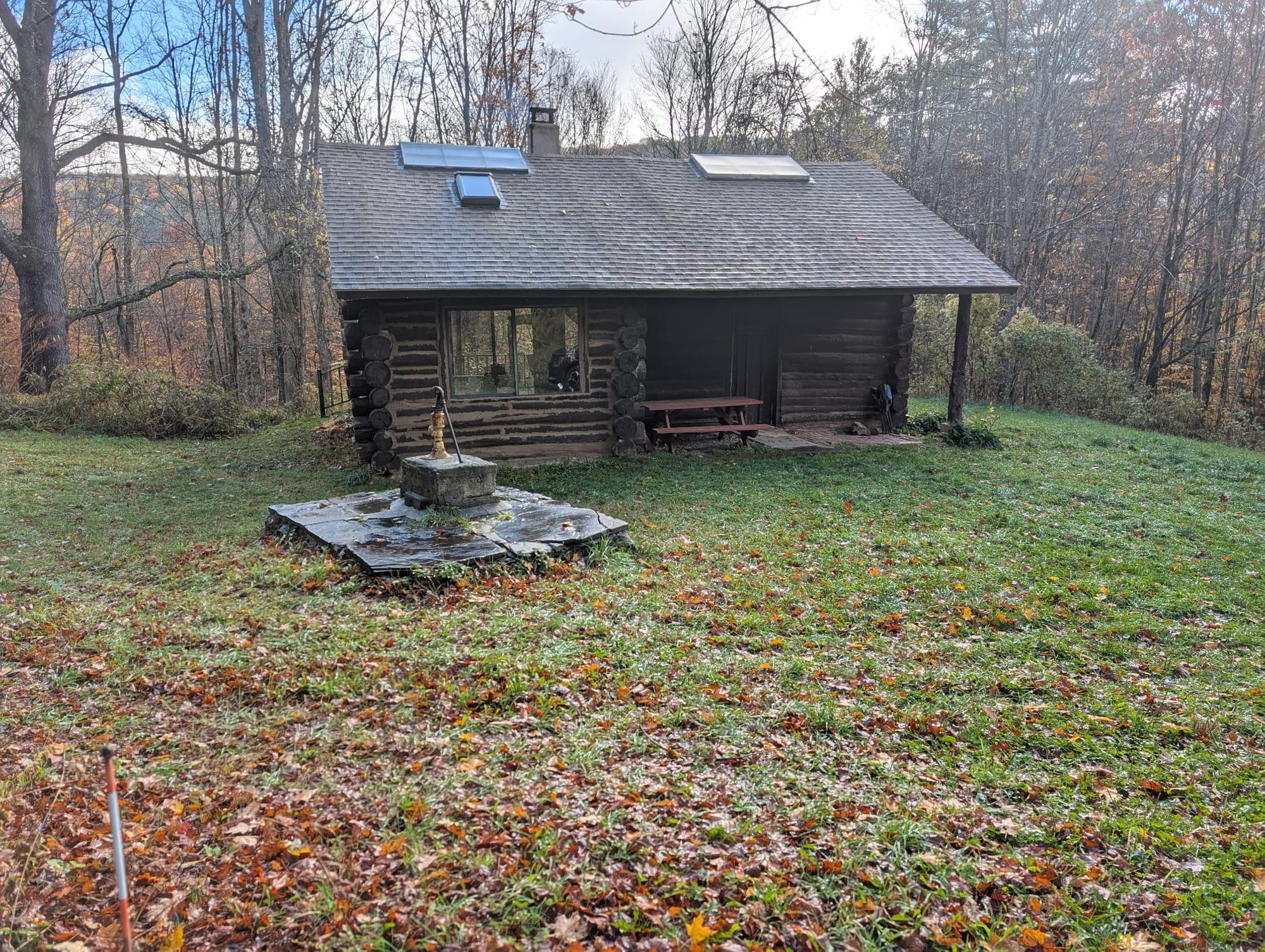 Since it was so last-minute and for many cabins this was the last weekend before they closed for the winter, a couple of my top choices weren't available. But then I found Round Top Retreat (Hipcamp, What3Words) about 15 miles east of Ithaca, NY. It's a 100-year-old cabin with no electricity, a hand-operated water pump on a well, an outhouse, and two wood-burning stoves. It comes with pre-split wood and has been updated with new(ish) windows, insulation, and a loft for sleeping. It is right on the edge of Robinson's Hollow State Forest, is 120 miles from home, and there are level-3 EV charging stations at the West Junius truck stop, which is right en route. Perfect!