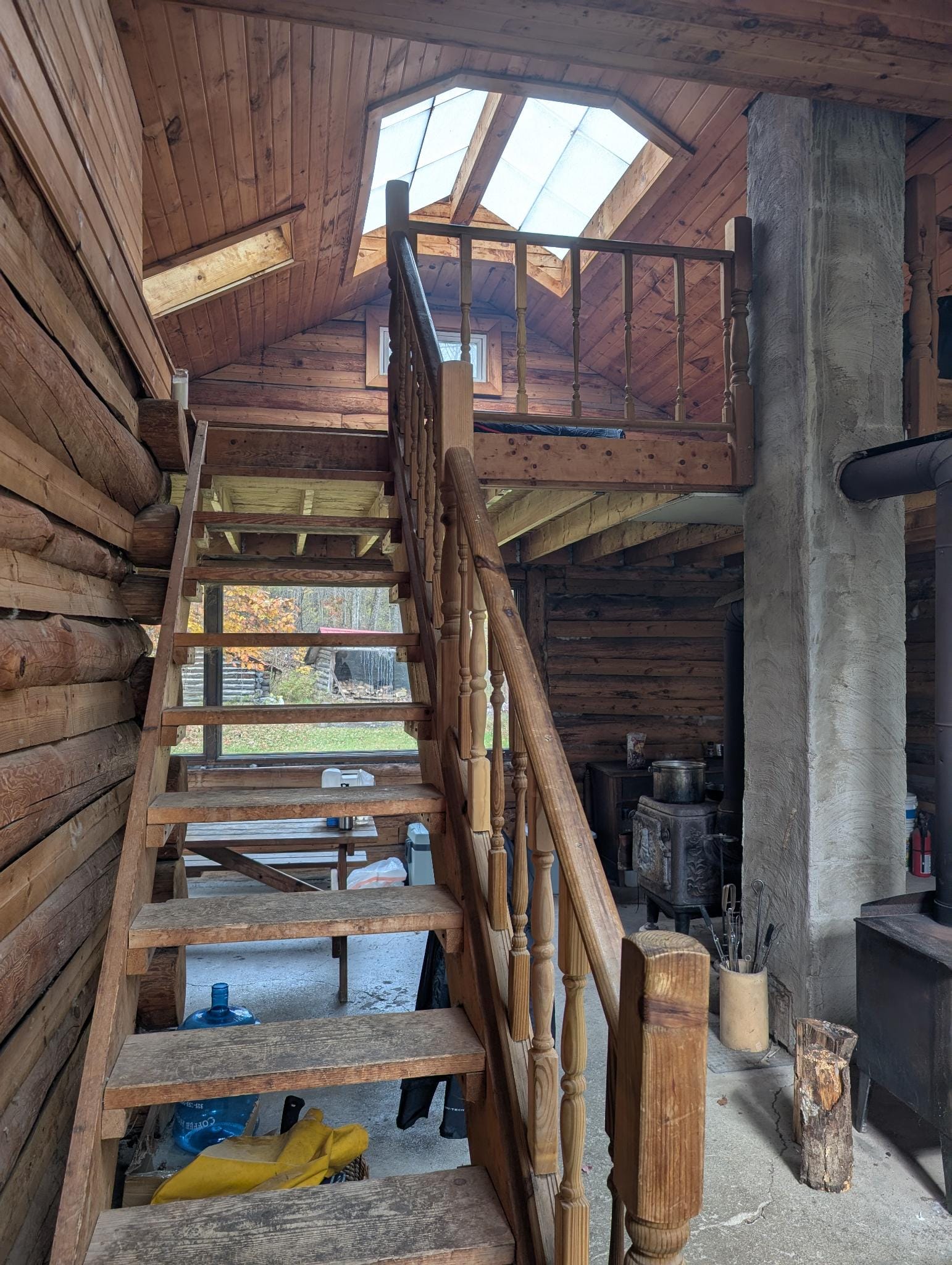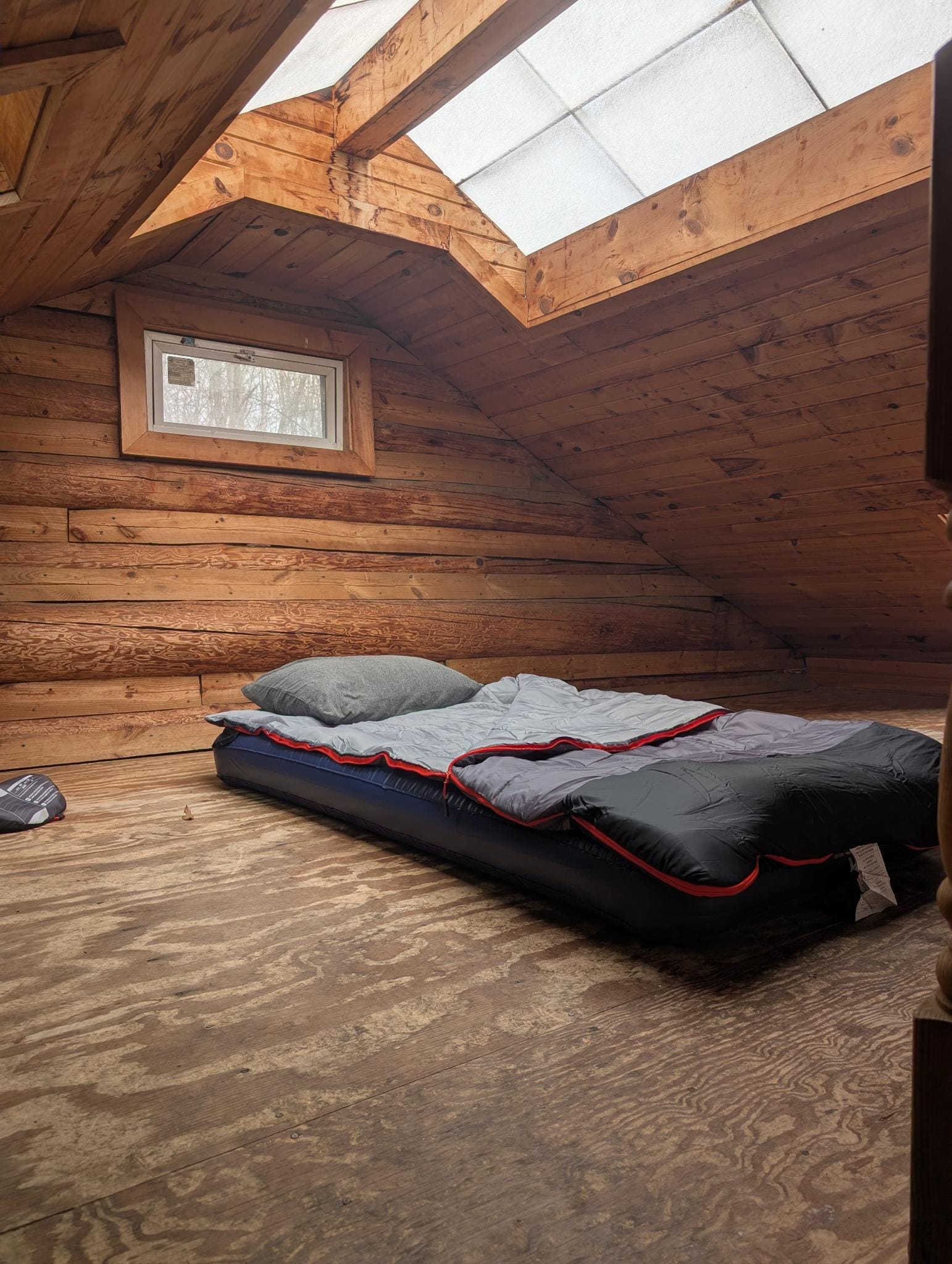 Saturday went much more smoothly. I was woken up at 8:00 AM by the sunlight coming in through the skylights above the loft. It was pretty chilly (around 40°F) since the fire from last night went out at some point in the night. I immediately got started making another for my breakfast. While the stove warmed up, I had my first opportunity to take some pictures of the cabin.