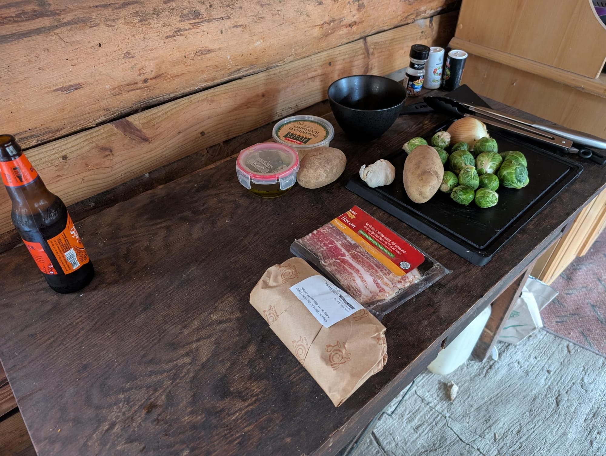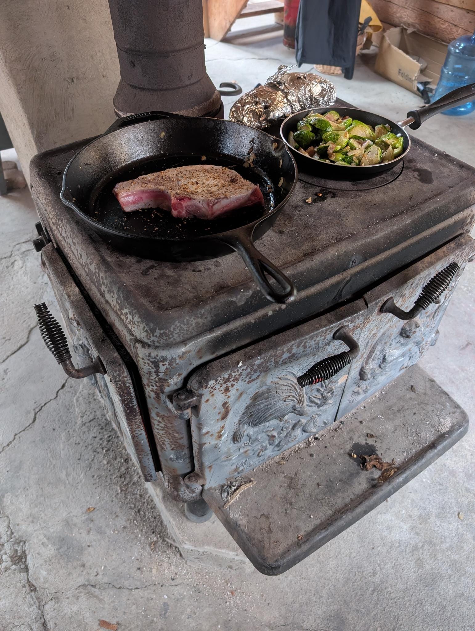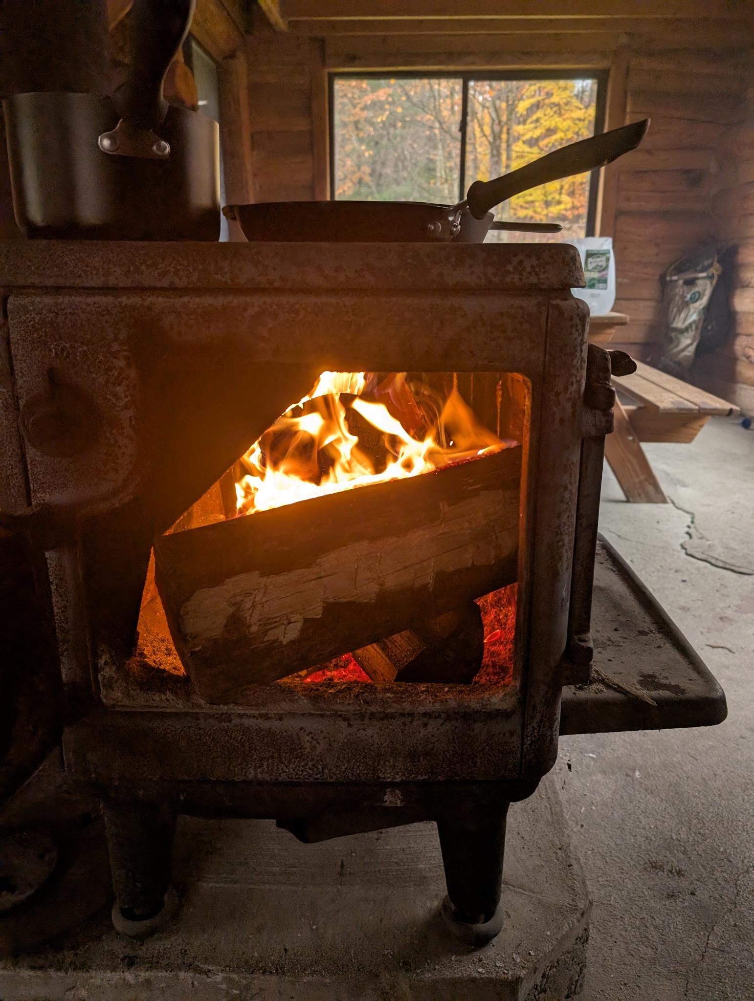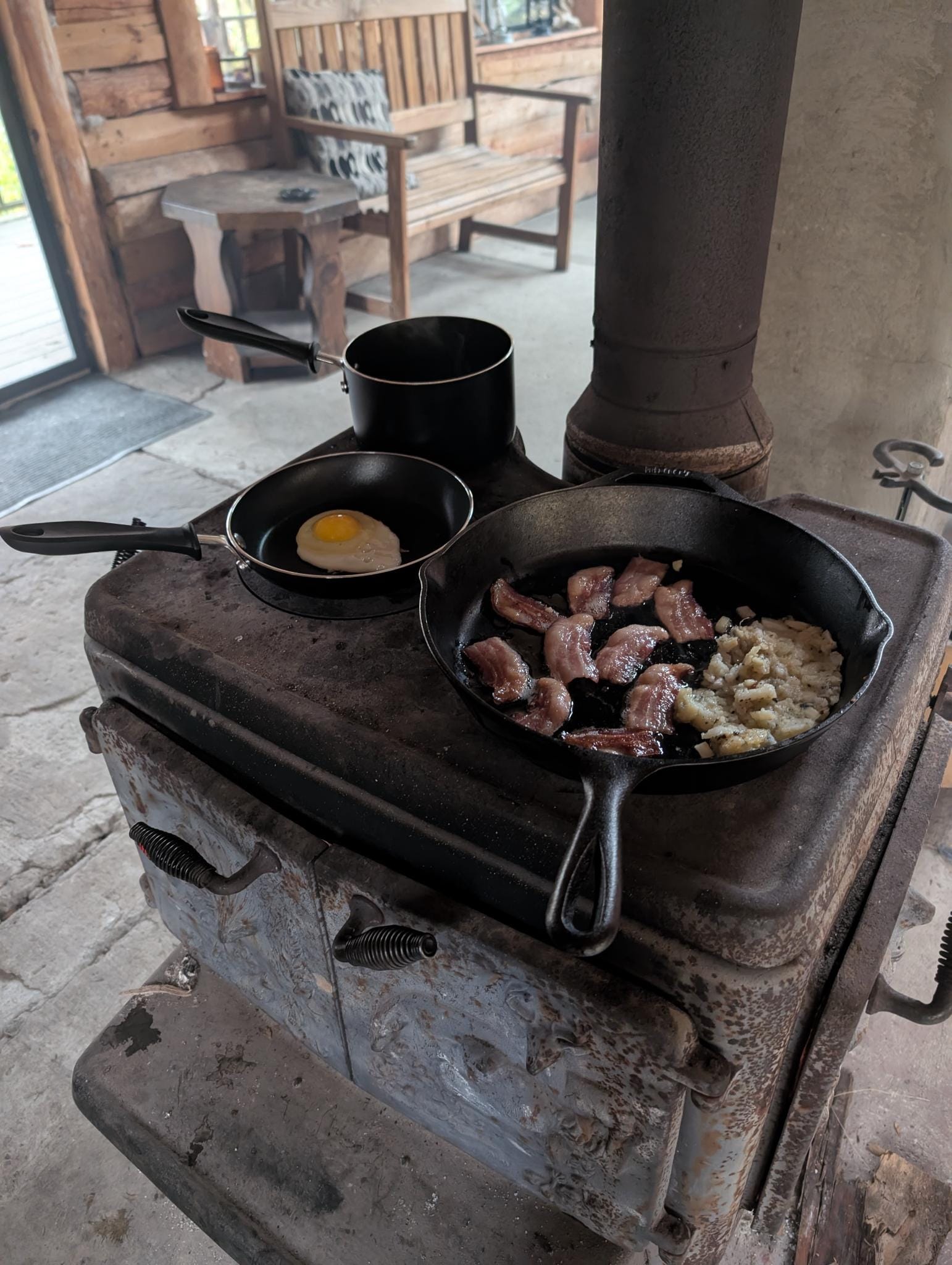 At around 9:30 AM, with the stove nice and hot, the cabin had warmed up (around 60°F), and I could start cooking.