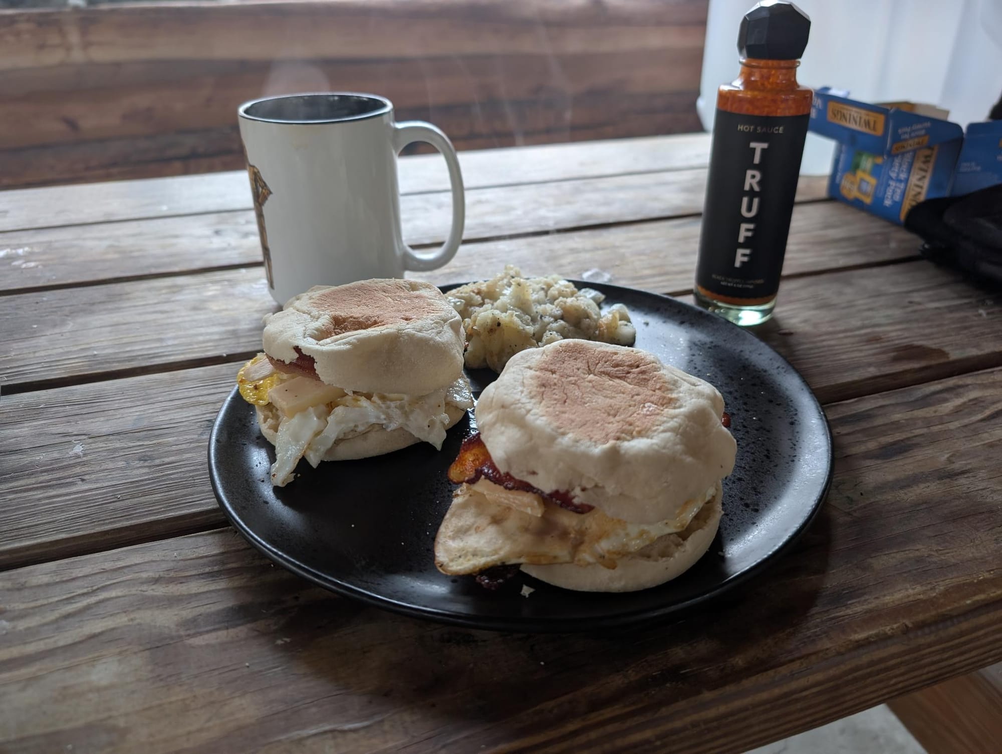 Tea, breakfast sandwiches (an over-medium egg, bacon, smoked Gouda cheese, and truffle hot sauce on an English muffin), and a failed attempt at hash browns made from a potato I had baked the night before. (It didn't crisp up as I had hoped, but it was still good.)