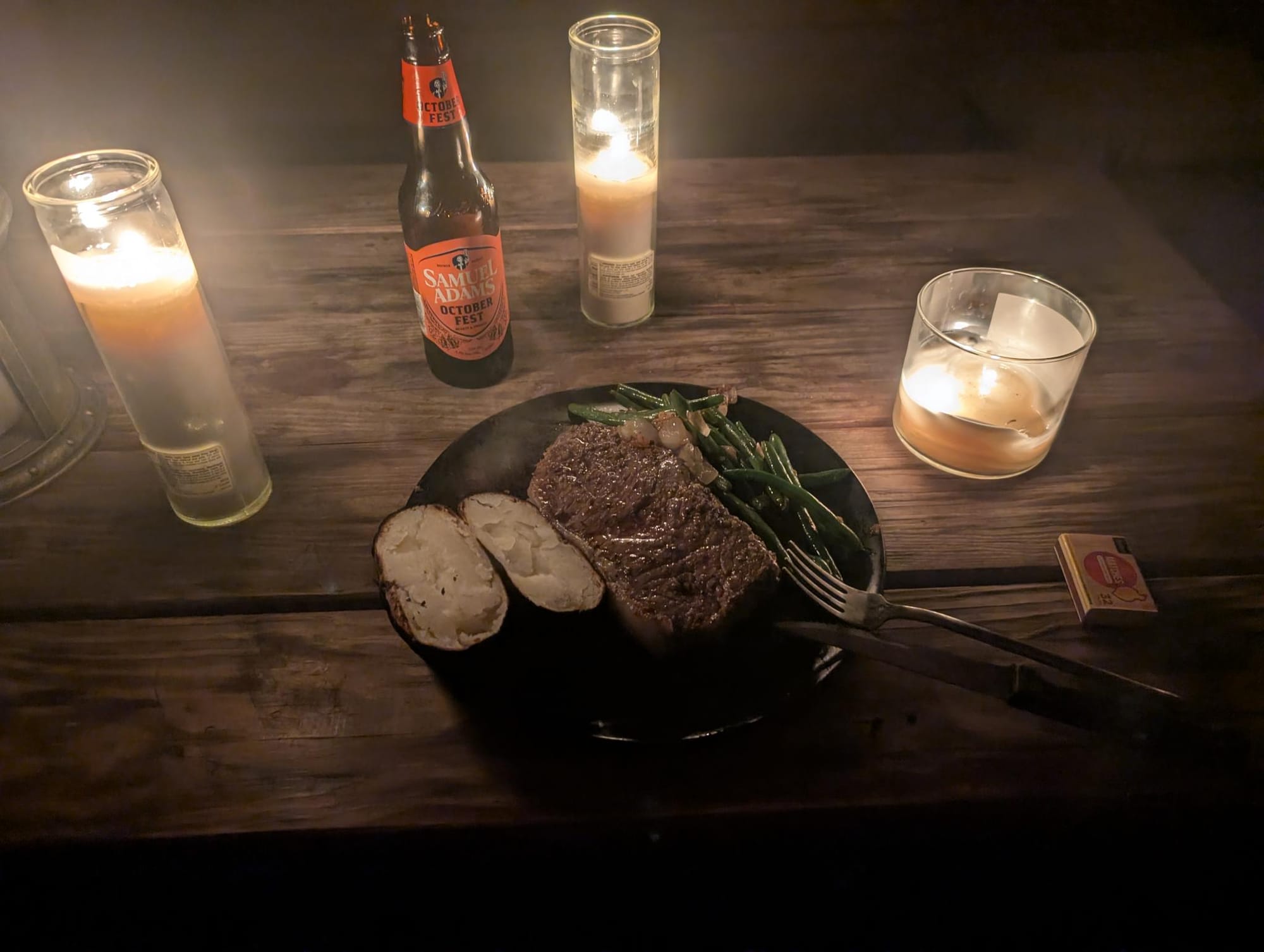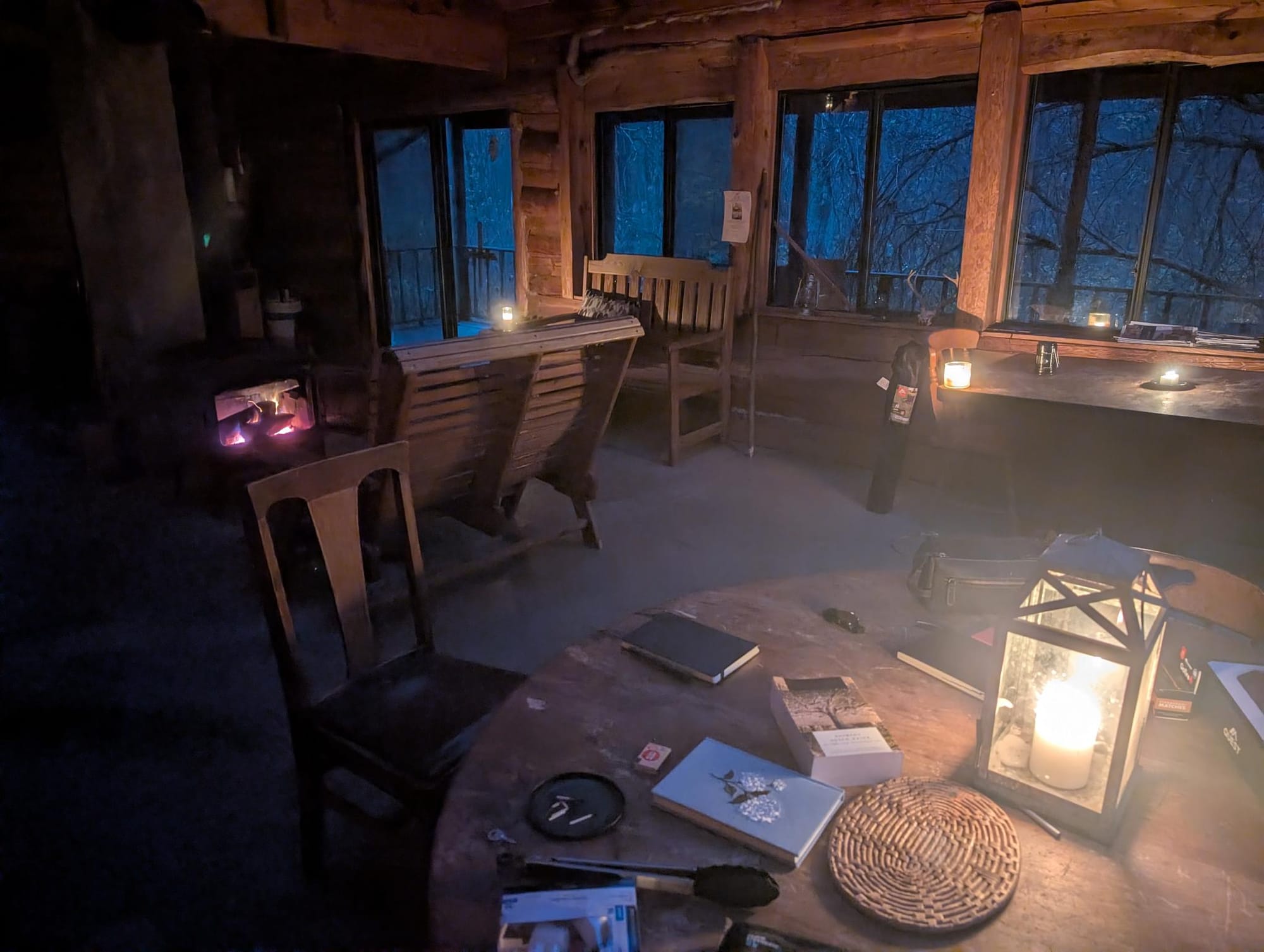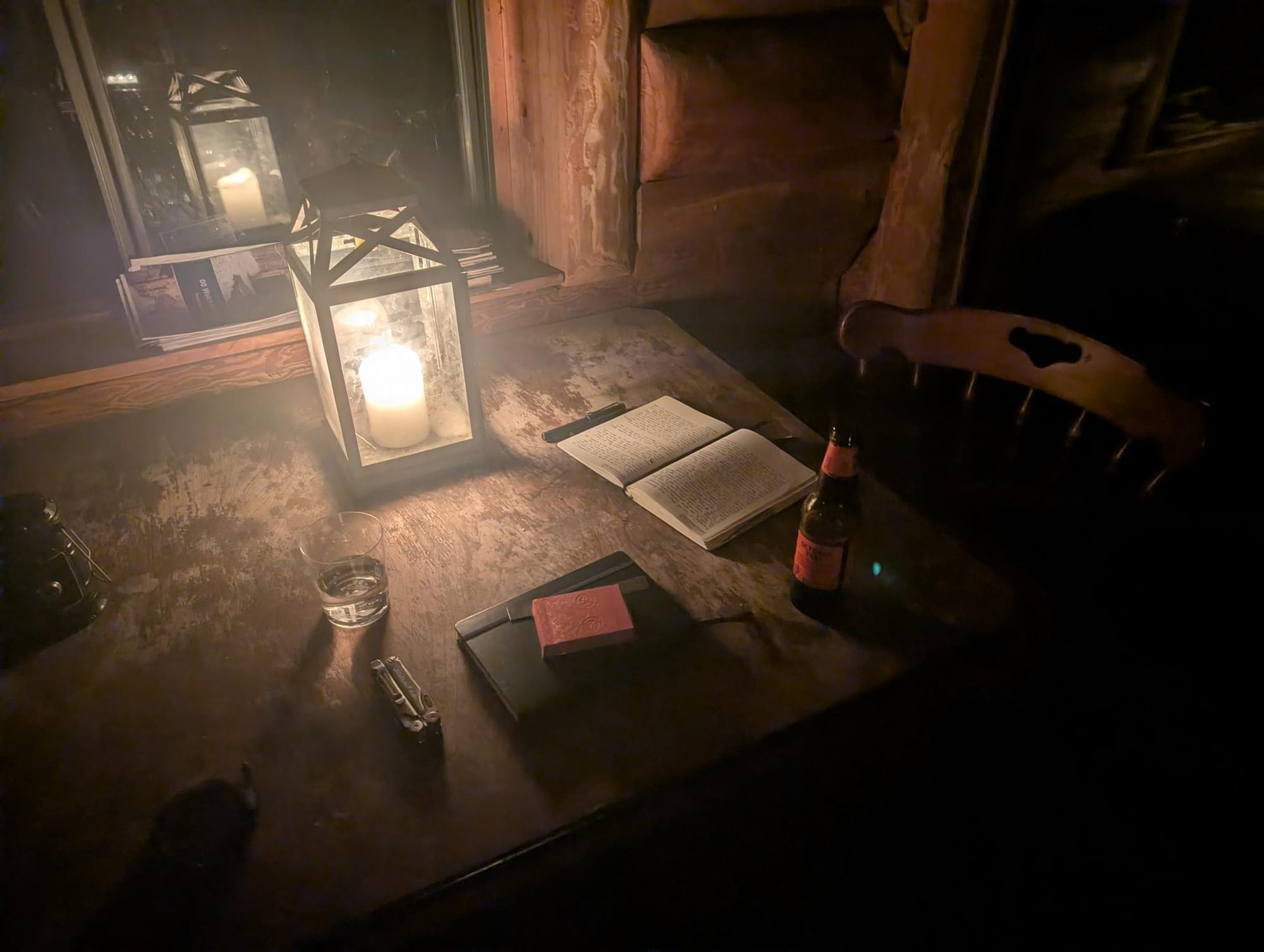 After dinner, I did the dishes; this time with daylight and warm water. I did some more reading by the fire until dusk, then lit some candles and continued playing a solo journaling RPG I have been working on, Thousand-Year-Old Vampire.